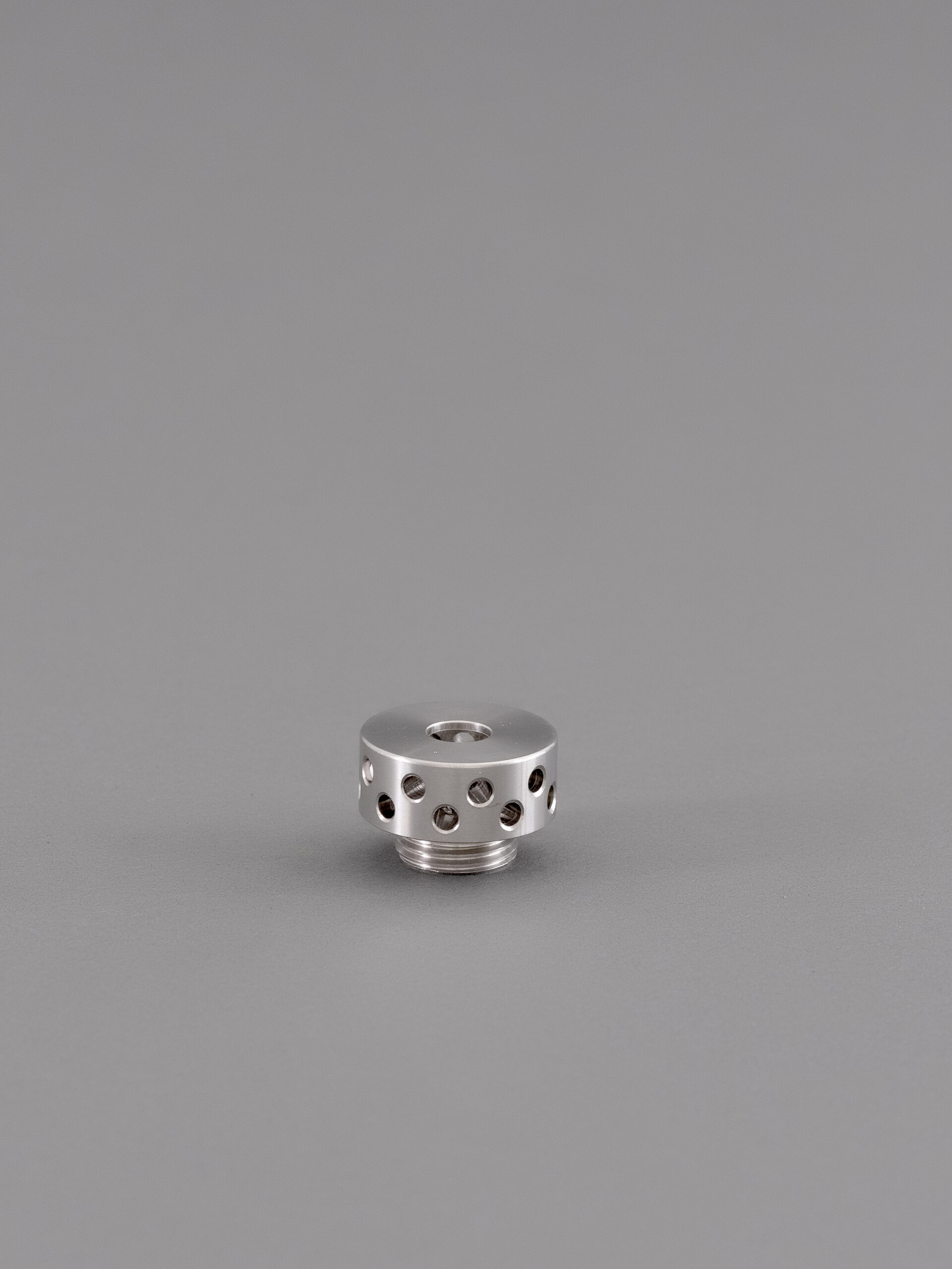 Diffuseur en acier inoxydable compatible avec toutes les chichas Dum de la série SS. Se visse au bas de la tige immersive. On l’appelle communément le silencieux car il a pour fonction de casser les bulles provoquées par le tirage et, par conséquent, d’amortir le bruit produit par les remous de l’eau du vase.